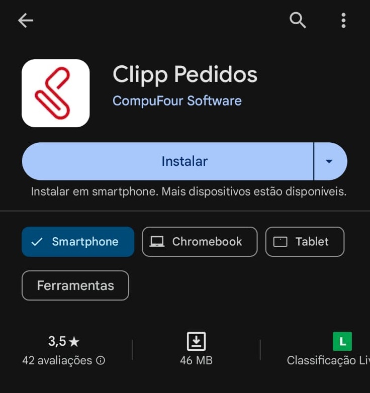 Para efetuar o download do aplicativo acesse a Play Store e pesquise por Clipp Pedidos
