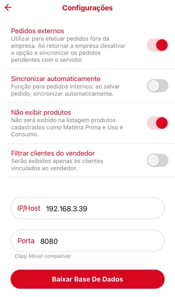 Originalmente o aplicativo já estará configurado para pedidos Internos, (funcionando na mesma rede da empresa), então nos campos de IP/HOST e Porta será necessário adicionar os mesmos valores contidos no ClippMovel.exe (inclusive com os pontos).