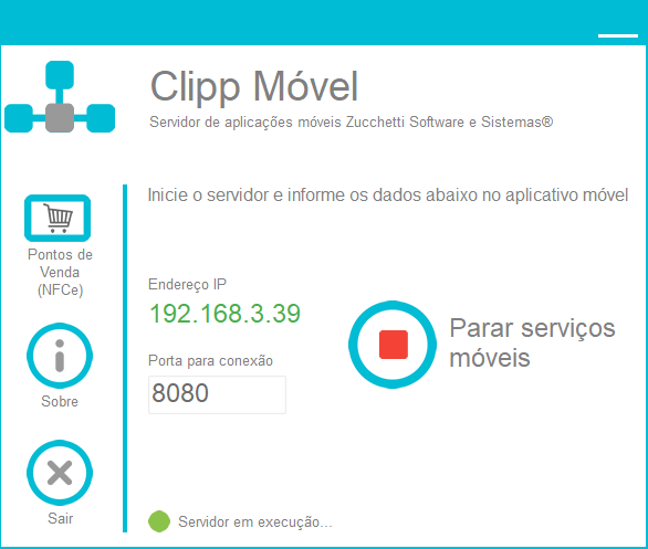 Este aplicativo será responsável por conectar o aplicativo móvel ao sistema, portanto, o mesmo deverá permanecer aberto durante a utilização do aplicativo.