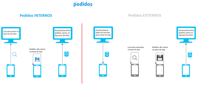 Ao acessar o aplicativo é possível configurar para Pedidos Internos ou Pedidos Externos. Para os pedidos internos, será acessada a base de dados do computador servidor e os dados serão atualizados em tempo real. Já os pedidos externos, o conteúdo da base de dados é salvo no celular para que seja possível realizar pedido de venda e orçamentos fora do estabelecimento sem acesso a internet e os dados serão atualizados somente quando o aplicativo e o servidor estiverem na mesma rede.