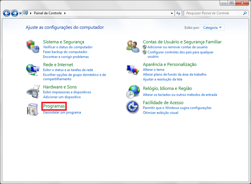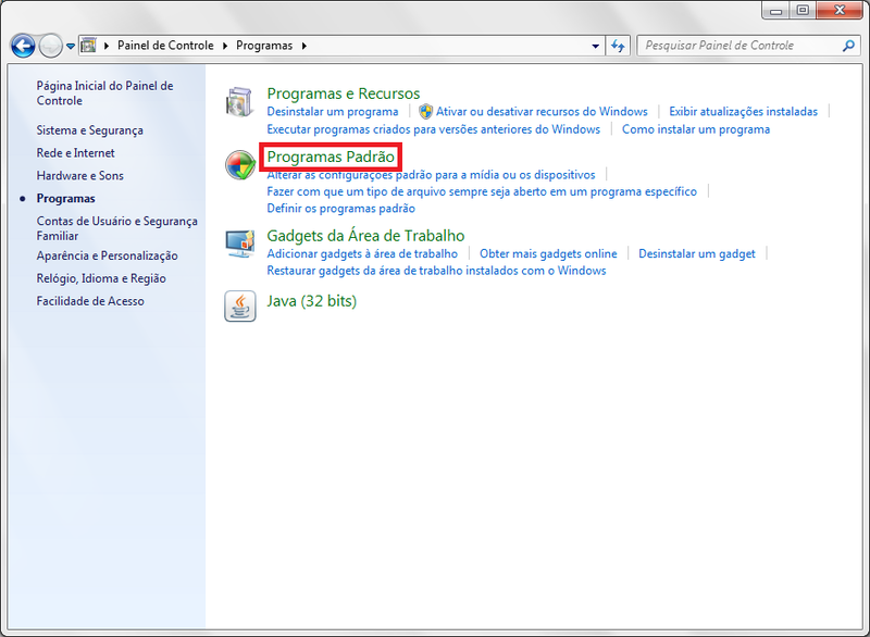 Para definir o programa padrão para visualizar arquivos com a extensão HTM, acesse o Menu Iniciar e vá até o Painel de Controle, na janela que foi aberta clique em Programas.