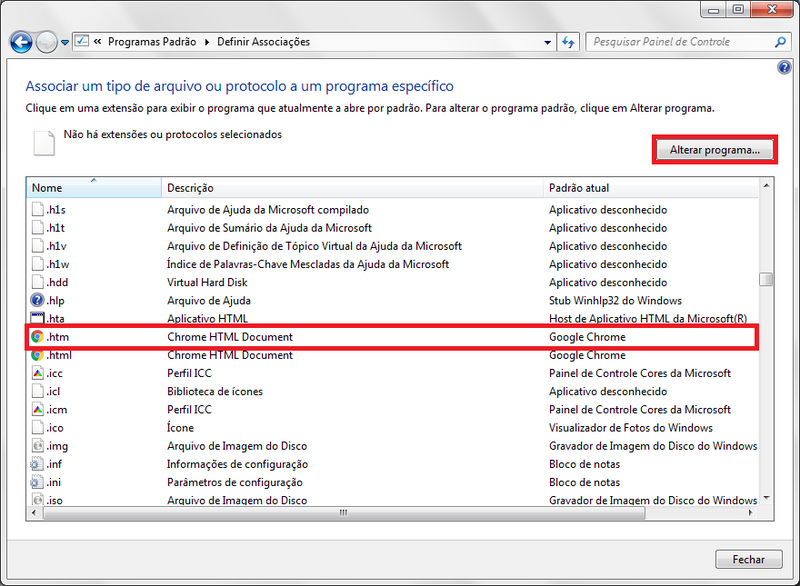 Na lista que foi apresentada, localize na coluna Nome a linha referente a .htm, selecione a opção e clique em Alterar Programa.