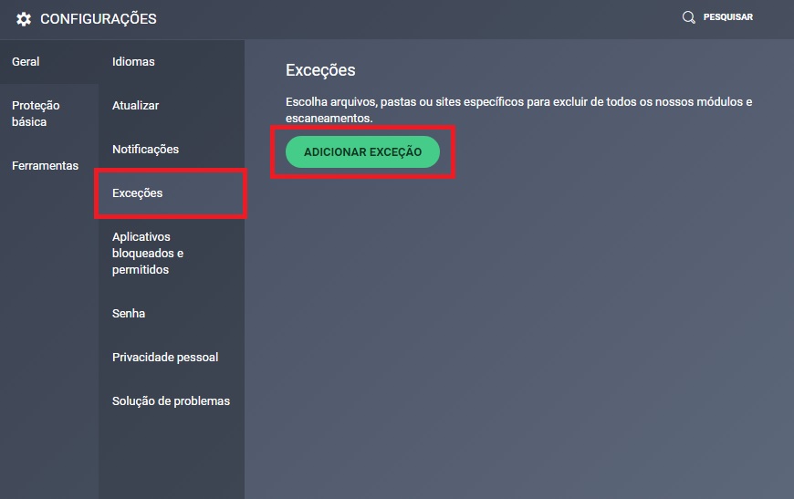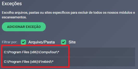 Dentro da interface do antivírus precisará efetuar a configuração de Exceções. Esta ferramenta permite deixar uma pasta fora do escaneamento dos módulos de proteção do AVG, neste caso, precisaremos incluir a pasta Compufour e a pasta Firebird as exceções do antivírus.