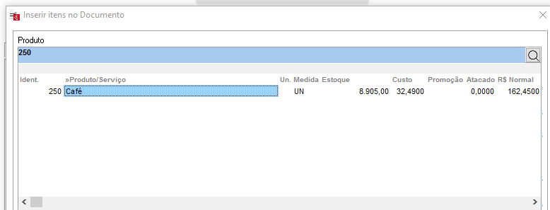 Após selecionar o produto, basta informar sua quantidade, valor unitário e desconto, quando houver, e clicar em OK.