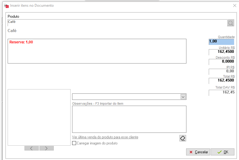 Caso o produto contenha foto cadastrada, marcando a opção Carregar Imagem do produto, apresentará a mesma no lançamento.