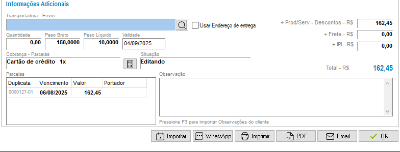 - Informações Adicionais: será possível definir antecipadamente qual Transportadora fará a entrega da mercadoria, bem como informar o Valor do frete. Também será possível definir a Validade deste pedido e os Parcelamentos que poderão ser utilizados na importação do pedido para a nota ou cupom. Por fim, podem ser adicionadas Observações para o pedido.