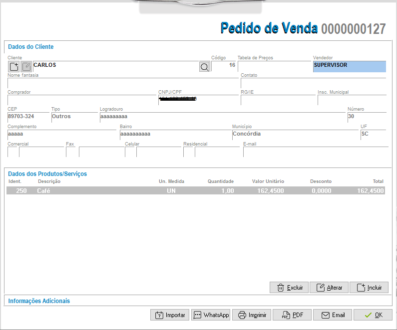 Para gravar o pedido, clique em OK. Também é possível realizar a impressão do mesmo, gerá-lo em PDF ou enviar por e-mail.
