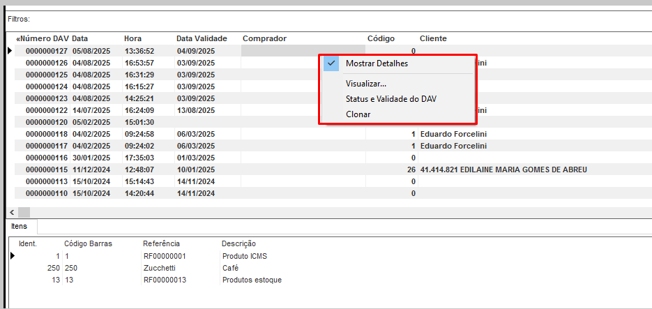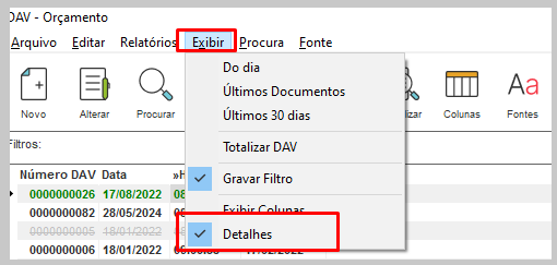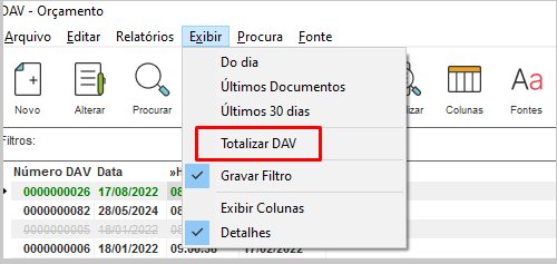 Para exibir os totais dos DAVs, clique no menu Exibir - Detalhes;