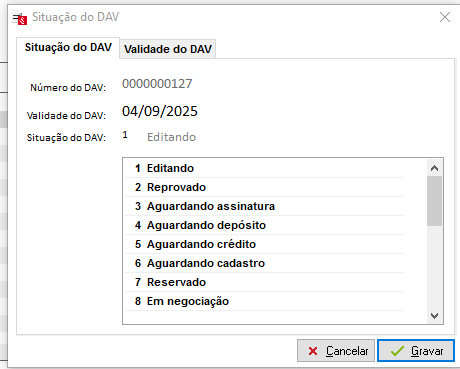 – Status e Validade do DAV: Esta opção permite alterar os Status do DAV e também sua data de Validade.