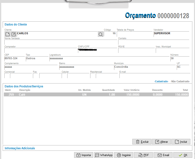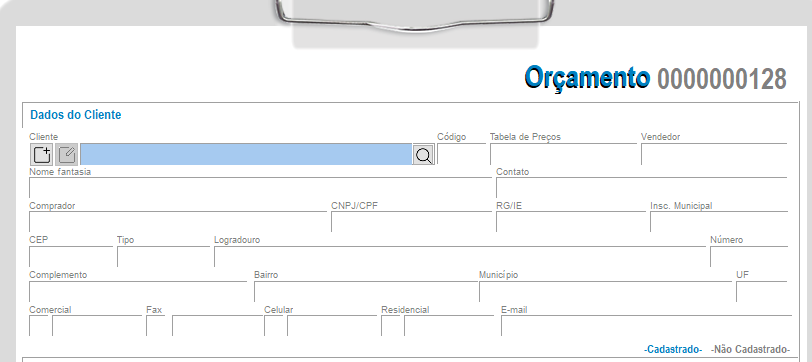 - Dados do Cliente: primeiramente será necessário informar o Cliente. Poderá optar por lançar o orçamento com o nome de um cliente ainda não cadastrado no sistema. Para isso, basta clicar na opção -Não Cadastrado- e prosseguir com o lançamento.