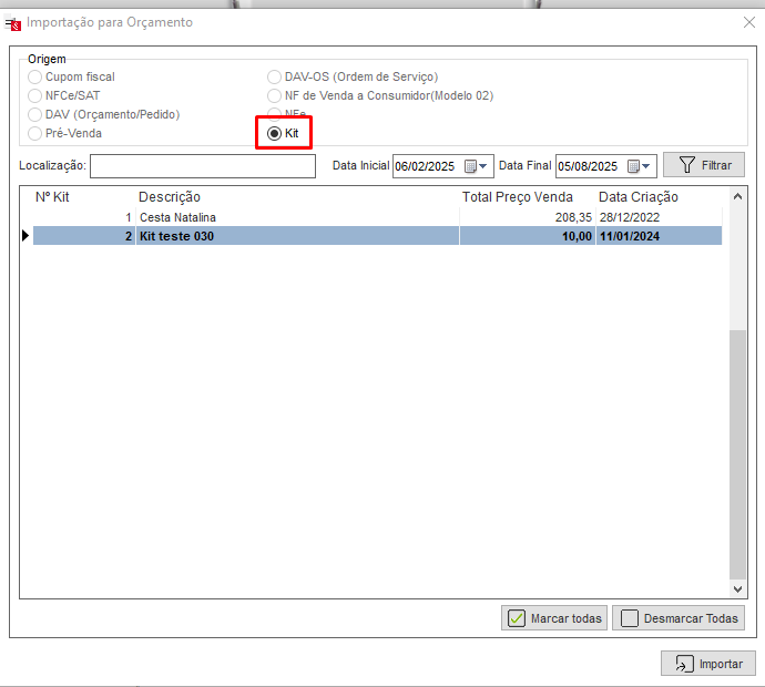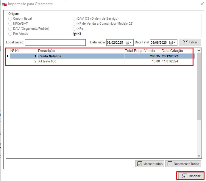 Localize o KIT em questão podendo ser pelo seu nome ou pelo código do mesmo. Ao selecionar o KIT clique em Importar