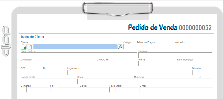 - Dados do Cliente: primeiramente será necessário informar o Cliente (este cliente deve estar previamente cadastrado para que ao selecioná-lo todas as suas informações sejam preenchidas automaticamente).