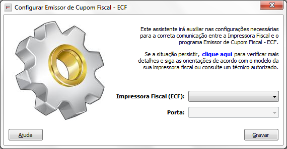 Na janela que foi aberta, no campo Impressora Fiscal (ECF) selecione o modelo da sua impressora fiscal e caso o campo Porta estiver habilitado para seleção, selecione a porta de comunicação em que a sua impressora fiscal encontra-se instalada. Para concluir, clique em Gravar e abra novamente seu Emissor de Cupom Fiscal.