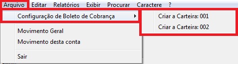 Clique no menu Arquivo - Configuração de boleto de cobrança e escolha a carteira desejada.