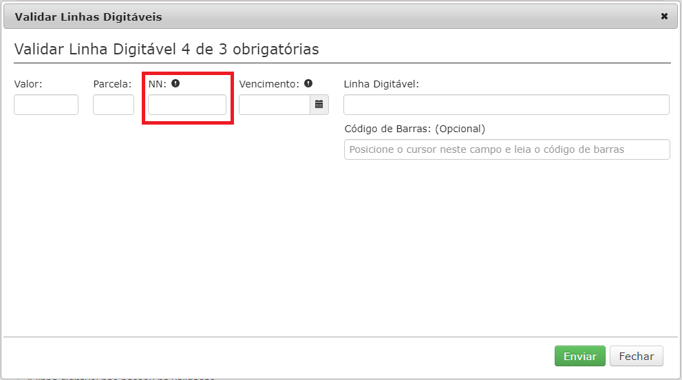 Na tela onde solicitar as informações abaixo, no campo NN informe o conteúdo do campo Nosso Número do boleto gerado DESCONSIDERANDO o último dígito: