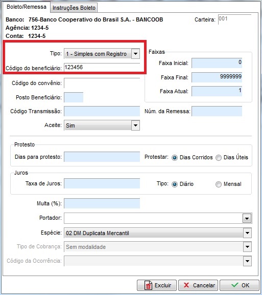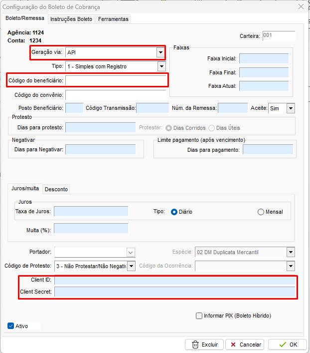 Na tela de configuração do Boleto de Cobrança é necessário cadastrar: