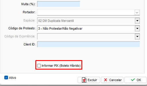 Com o cadastro do boleto via API concluído, na janela de configuração do mesmo você encontra a opção de Informar PIX (Boleto Híbrido).
