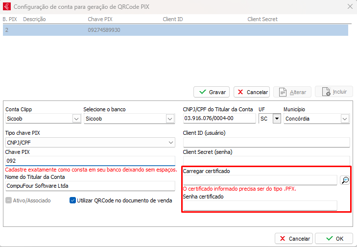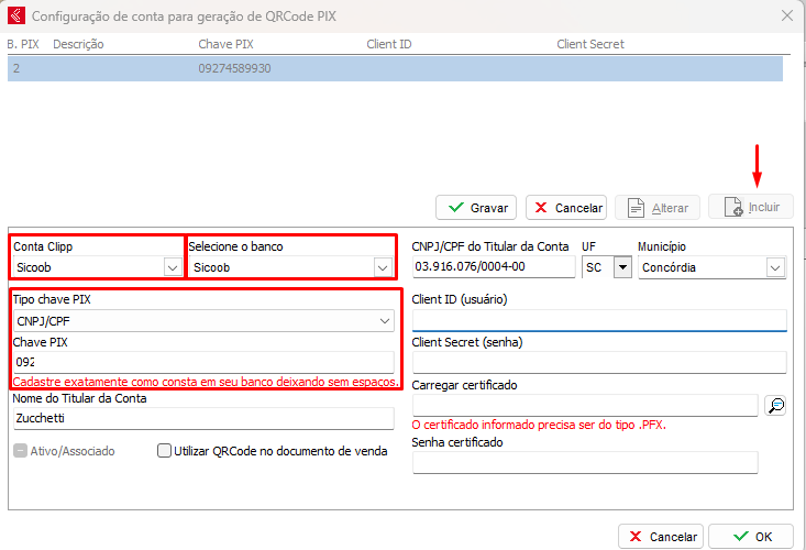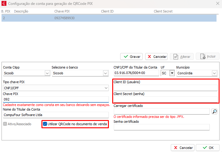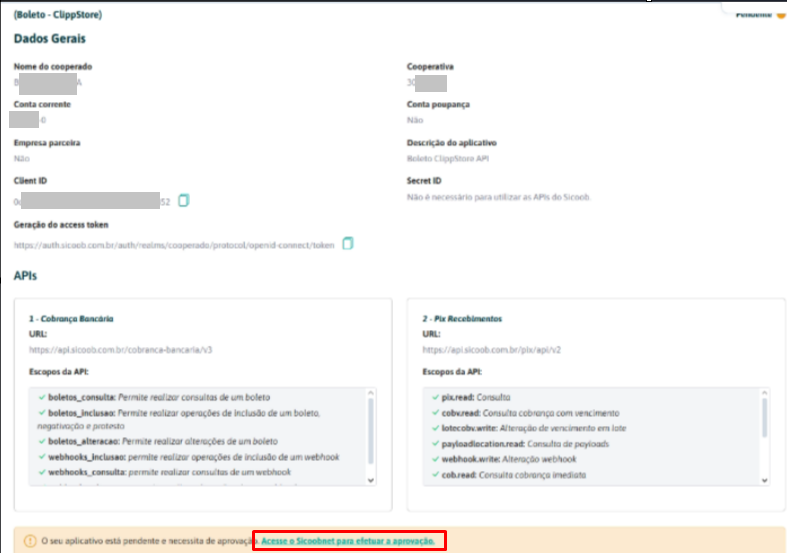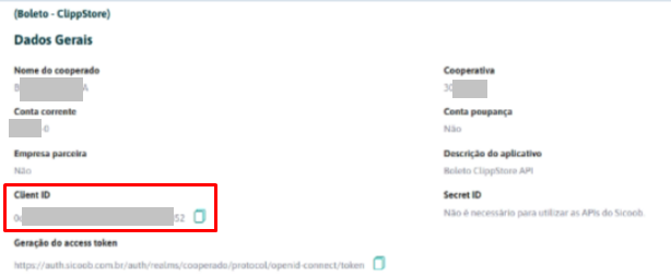 Com a informação Client ID gerada e autorizada no site do Sicoob, informe no sistema nas abas Client ID e Client Secret.