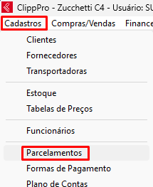 Feito os processos anteriores é necessário vincular a conta bancária a forma de pagamento PIX, portanto acesse o cadastro de parcelamentos acessando Cadastro e após isso Parcelamentos.