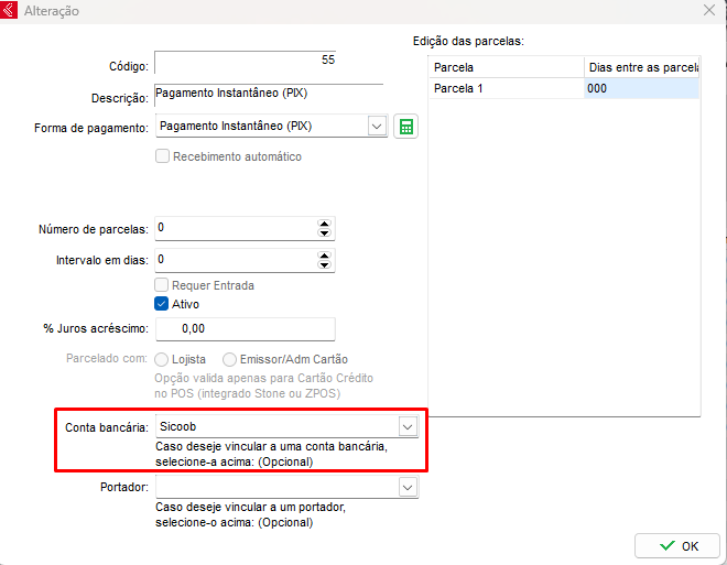 Localize o parcelamento PIX e abra o mesmo e no campo de Conta bancária selecione a conta bancária referente a Sicoob