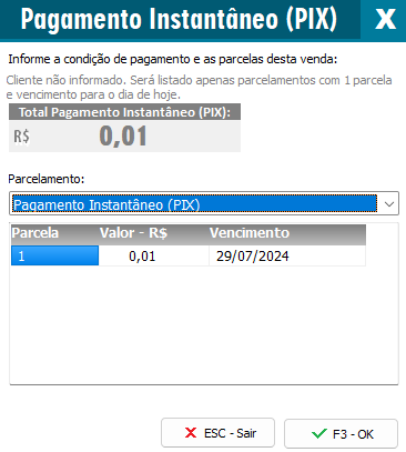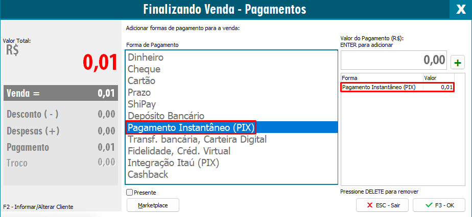 Após efetuar todas as configurações anteriores, ao finalizar a venda será apresentado as formas de pagamento, selecione o cadastro Pagamento Instantâneo (PIX) e a clique em F3-OK.