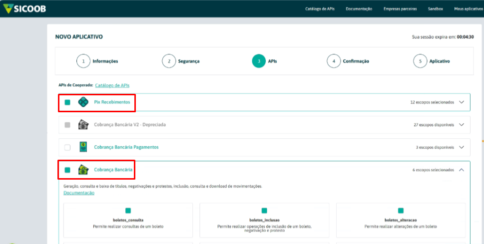 Selecione apenas as opções PIX Recebimentos e Cobrança Bancária