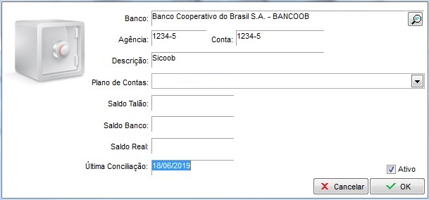 Na descrição preencha conforme achar conveniente, escolha o plano de contas desejado, os campos: Saldo Talão, Saldo Banco, Saldo Real e Última Conciliação serão preenchidos conforme ir movimentando valores no banco.
