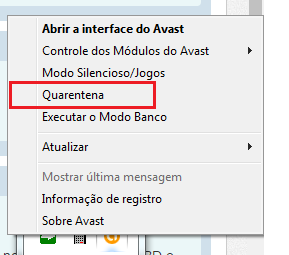 Primeiramente clique sobre o ícone do Avast na barra de ferramentas do Windows (próximo ao relógio) com botão direito do mouse e vá na opção Quarentena;