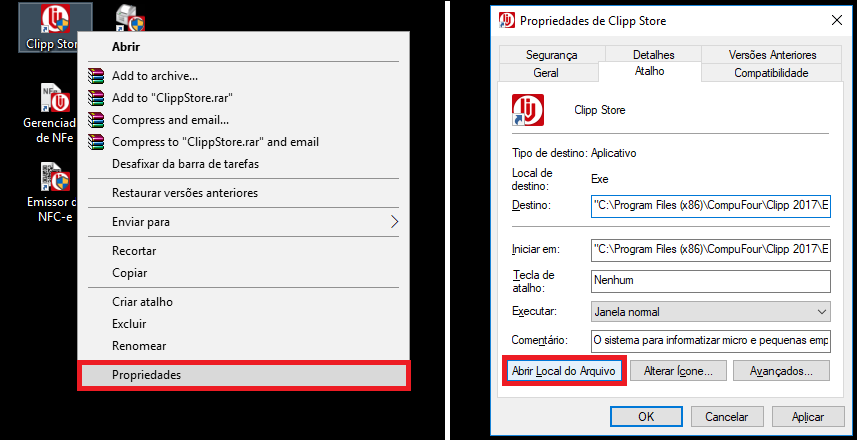 Em sua área de trabalho, sobre o ícone do Clipp Store, clique com o botão direito do mouse e vá em Propriedades - Abrir Local do Arquivo: