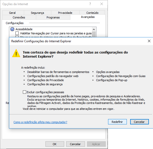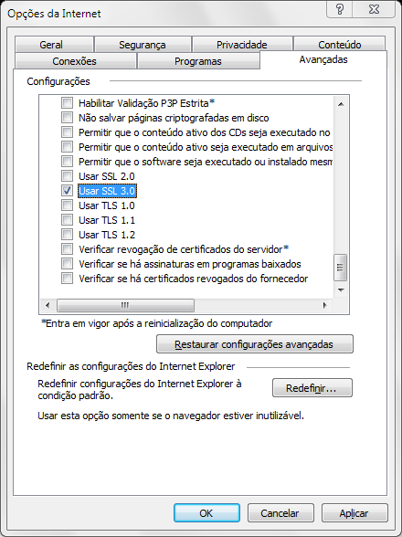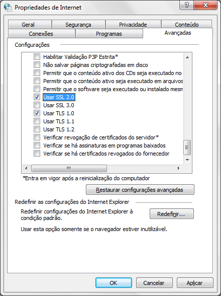 Acesse o navegador Internet Explorer, Ferramentas / Opções da Internet, na aba "Avançado":