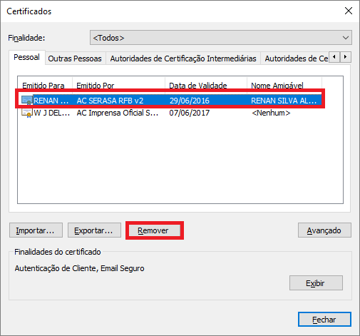 - Verifique e Remova os certificados que estiverem com a data de validade Vencida