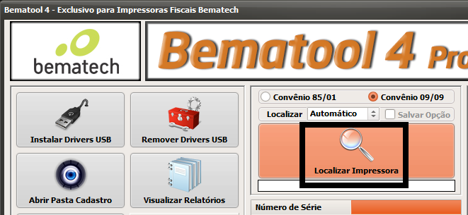 Acesse o Bematool 4 Pro, o atalho foi criado na área de trabalho e na tela apresentada, clique para Localizar Impressora: