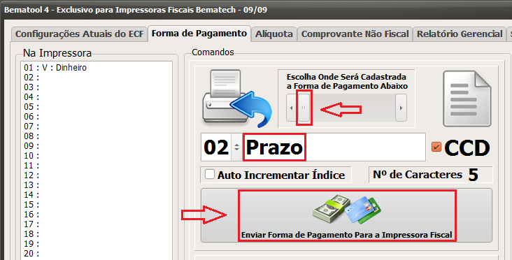 O Emulador da Bematech possui a forma de pagamento padrão Dinheiro. Cadastre as demais formas, como por exemplo: Prazo, Cheque, Cartão, seguindo os parâmetros conforme a tela abaixo: