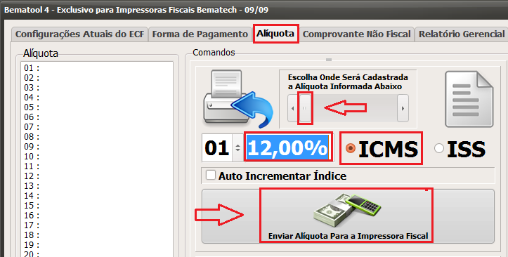 Da mesma forma, cadastre as alíquotas que irá utilizar no emulador: