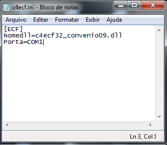Na pasta de instalação do programa Clipp Store, normalmente disponível em c:\Arquivos de Programas\CompuFour\Clipp\Exe, localize o c4ecf.ini. No arquivo, ajuste conforme o nome da impressora, neste caso “convenio09”. Exemplo do arquivo abaixo: