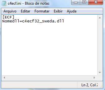 Na pasta de instalação do programa Clipp Store, normalmente disponível em c:\Arquivos de Programas\CompuFour\Clipp\Exe, localize o c4ecf.ini. No arquivo, ajuste conforme o nome da impressora, neste caso “sweda”. Exemplo do arquivo abaixo: