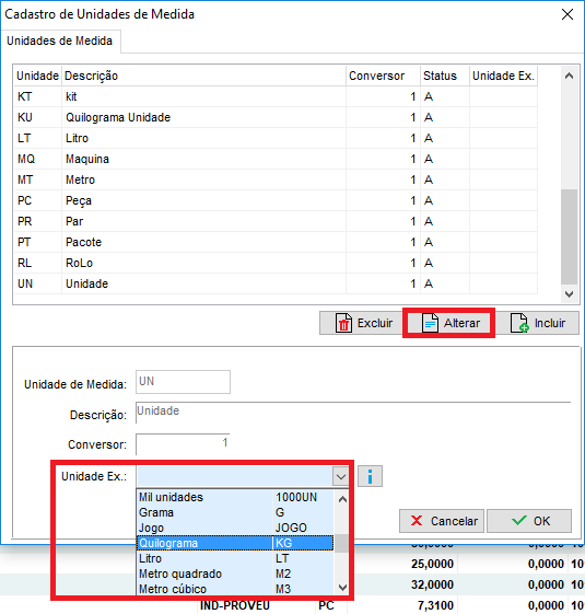 Depois de conferir a unidade de medida compatível na tabela, acesse novamente o Estoque - clique no menu Arquivo - Unidades de medida..., localize a unidade utilizada no produto e clique em Alterar, feito isso inclua no campo Unidade Ex.: a unidade correta, conforme a tabela do NCM.