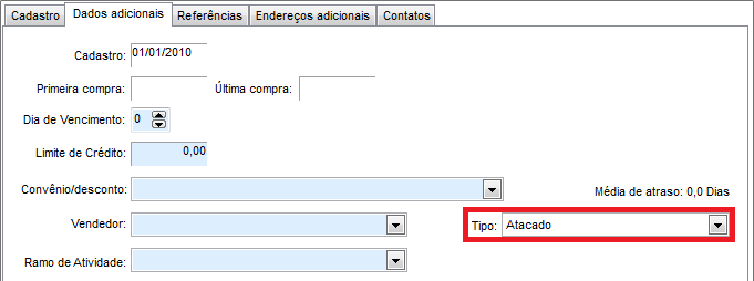 Para atribuir o preço de atacado sempre que determinado produto for vendido a um cliente em específico, no cadastro dos Dados Adicionais do Cliente, deverá ser selecionado o tipo Atacado. Por padrão todos os clientes serão atribuídos como Varejo, utilizando o Preço em R$.