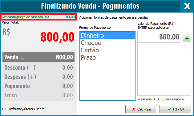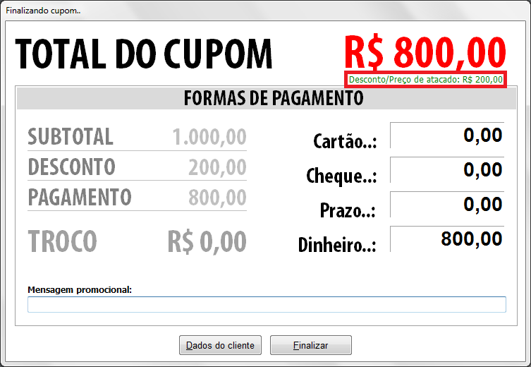 - Quando o estado for PAF-ECF, irá atribuir a diferença entre os valores do preço normal e atacado no campo desconto;