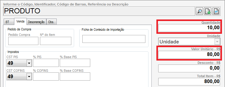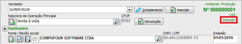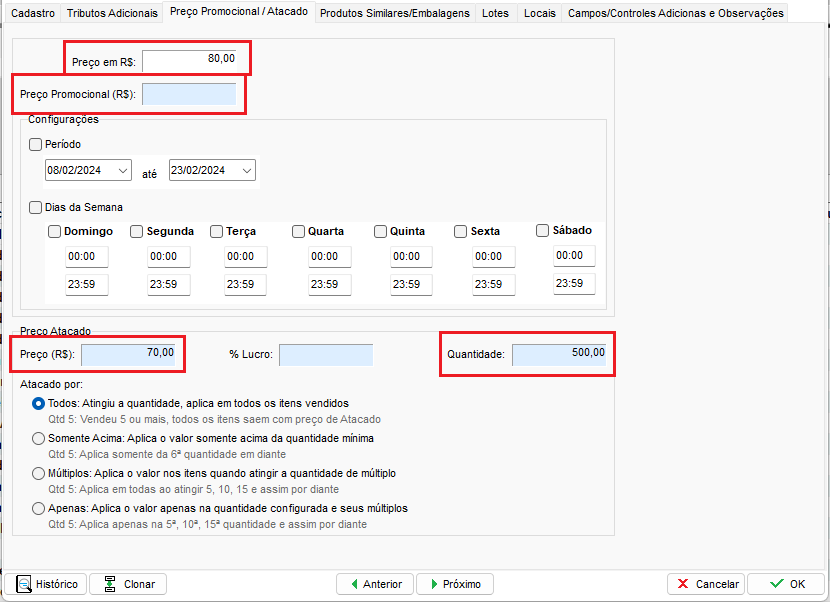 OBS: O preço de atacado somente será considerado na NFC-e (Nota Fiscal Eletrônica do Consumidor ou SAT) e no ECF (Emissor de Cupom Fiscal) quando for lançada uma quantidade igual ou superior a informada no cadastro do produto no campo Quantidade para atacado.