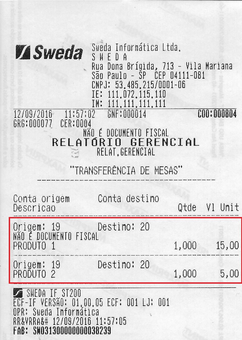 Abra o menu F7 do Emissor de Cupom Fiscal e clique na opção: Transferência de Mesa. Será impresso o relatório com a Mesa de origem e destino, cada produto e respectiva quantidade.
