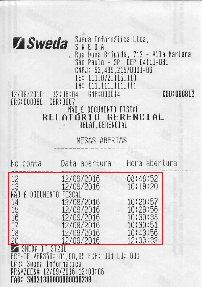Abra o menu F7 do Emissor de Cupom Fiscal e clique na opção: Mesas Abertas. Será impresso o relatório com número da(s) mesa(s) aberta(s) e respectiva data/hora de abertura: