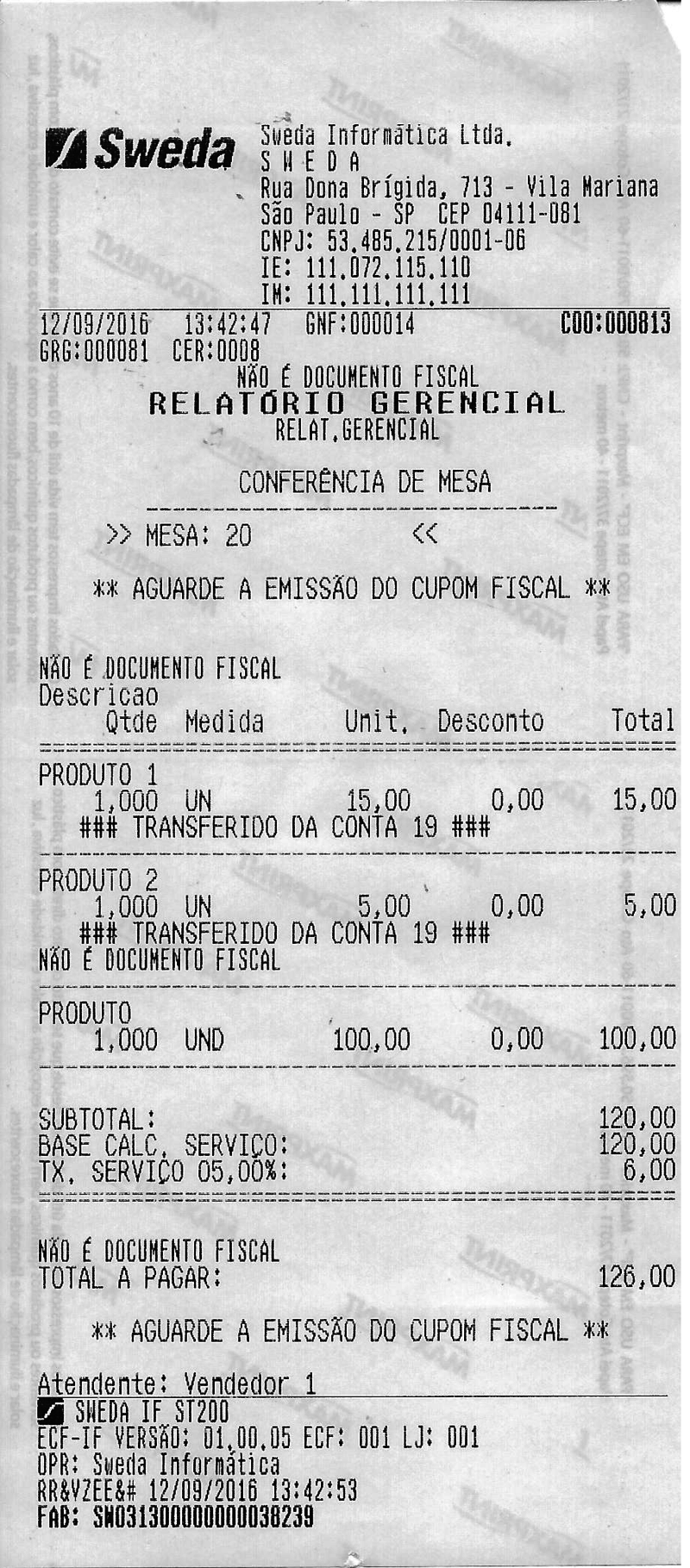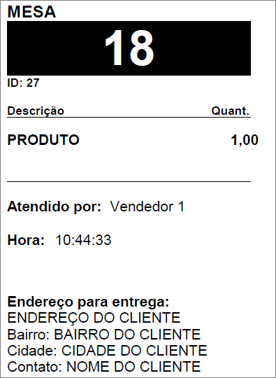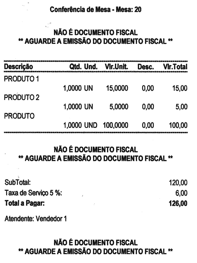 Este relatório será impresso na mesma impressora configurada para impressão de NFC-e. Serão impressas as informações do número da mesa, os produtos e suas respectivas quantidades e valores.