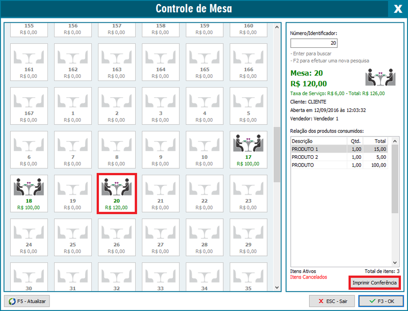 Abra o menu F10 do Emissor de Cupom Fiscal, e clique na opção: Bares, Restaurantes e Similares > Conferência de Mesas. Será impresso o relatório com o número da mesa, os produtos, quantidades e valores.