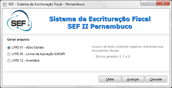 Na tela inicial defina qual tipo de arquivo deseja gerar e clique em Avançar.