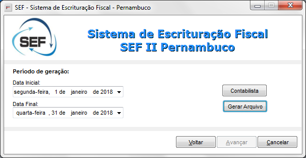 Defina a data inicial e a data final referente ao período que necessita gerar o arquivo e clique sobre o botão Contabilista.