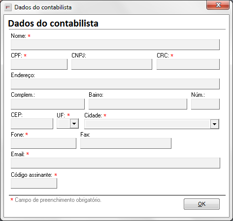 Informe os dados do seu Contabilista e clique no OK.