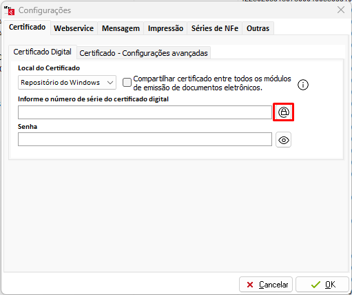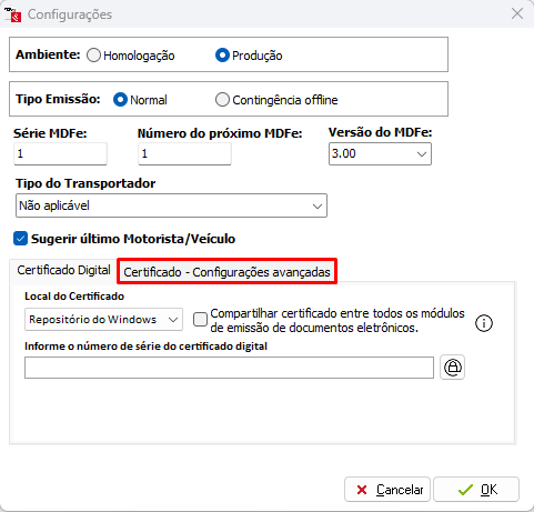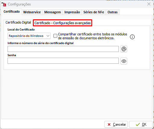 Caso for NFe ou CT-e, acesse o gerenciador de NFe ou o Emissor de CT-e, clique em Opções - Configurar, clique na opção Certificado - Configurações avançadas.