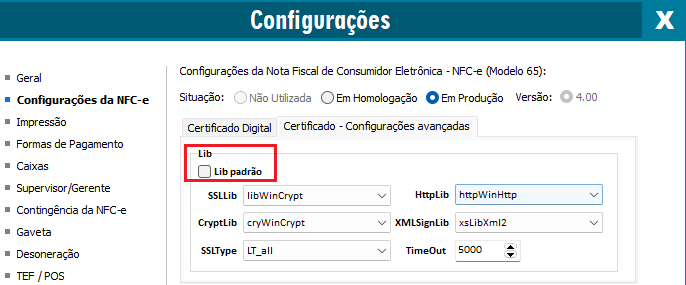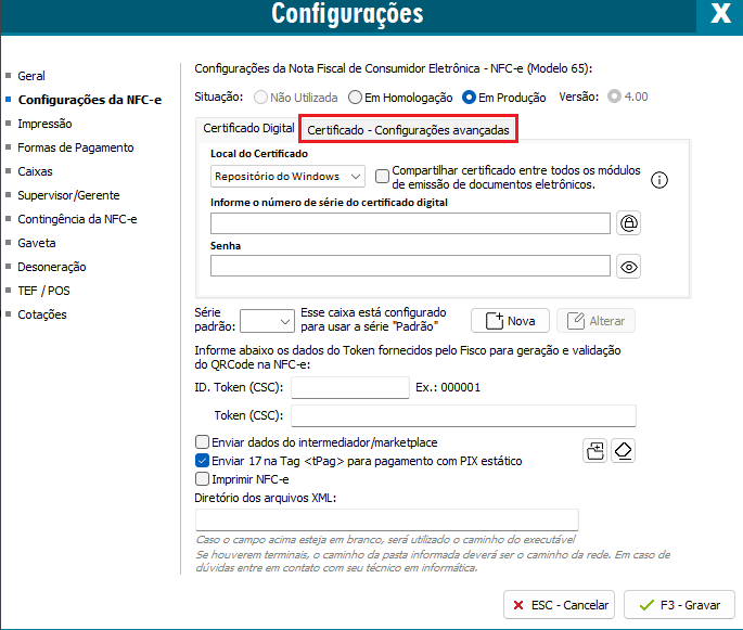 Caso for NFCe, acesse F10 - Configurações da NFCe, clique na opção Certificado - Configurações avançadas.