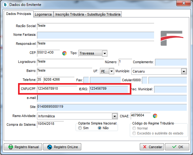 Abrirá a tela onde existe o cadastro do emitente, preencha as informações da empresa e em seguida o CPF no campo CNPJ/CPF seguido da Inscrição Estadual no campo IE/RG.